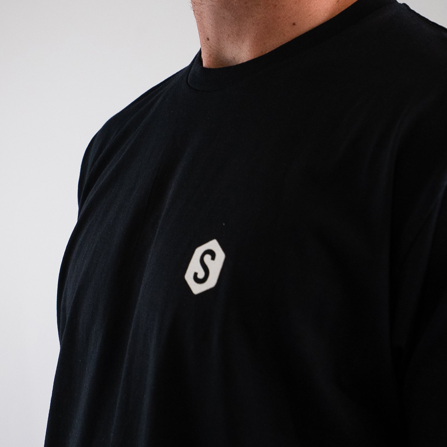 • Hexágono estampado en el pecho y logo "Hooked on a Happy Lifestyle" estampado en la espalda